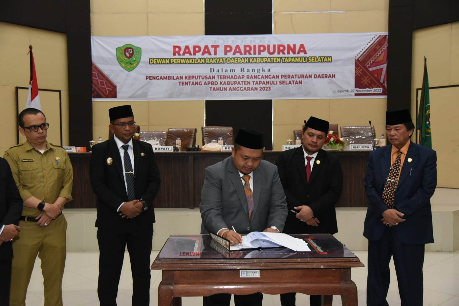 Hal itu dikatakan Bupati saat menghadiri Rapat Paripurna Dewan Perwakilan Rakyat Daerah (DPRD) Kabupaten Tapsel dalam rangka Pengambilan Keputusan Terhadap Rancangan Peraturan Daerah Tentang APBD Kabupaten Tapsel Tahun Anggaran 2023, di Ruang Rapat Paripurna DPRD Tapsel, Senin (7/11).