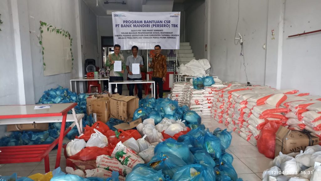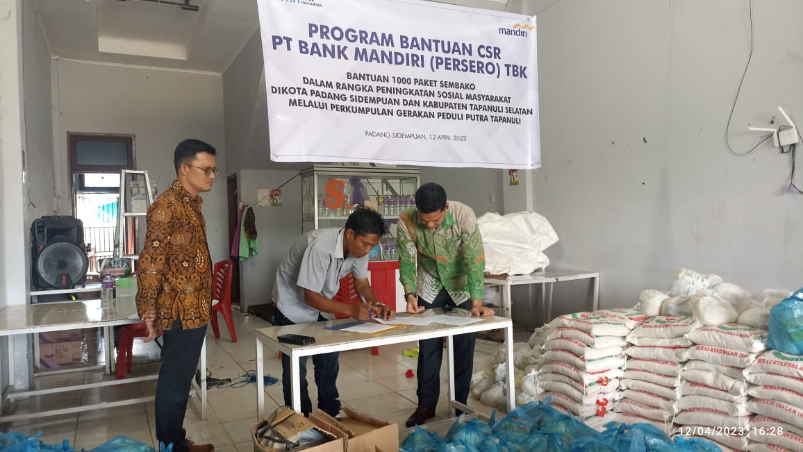 Kontrasindependen.com-Padangsidimpuan, Bank Cabang Mandiri Kota Padangsidimpuan Serahkan Seribu Paket Sembako Kepada Gerakan Peduli Putra Tapanuli untuk disalurkan kepada kaum duafa atau yang membutuhkan, serah Terima tersebut berlangsung dirumah aspirasi Sihar Sitorus Center di jalan lintas Padangsidimpuan sibolga, losung batu Padangsidimpuan Utara,Ujar Aprizal Akbar Kepala Cabang Mandiri Kota Padangsidimpuan saat dikonfirmasi awak media ini, Rabu (12-04-2023).