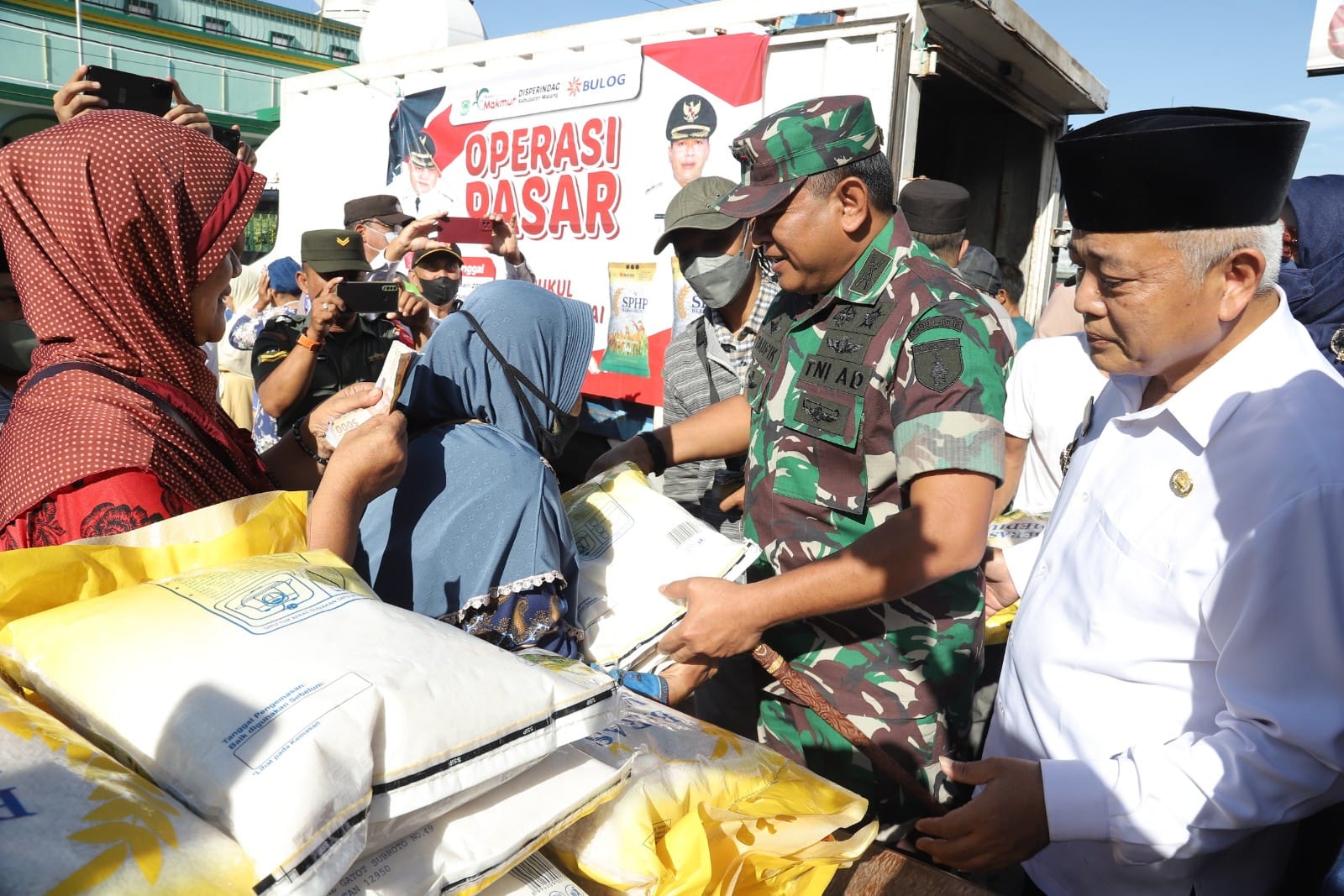 www.kontrasindependent.com Malang- Dandim 0818 Letkol Inf Taufik Hidayat dampingi Bupati Malang H.M Sanusi dalam kegiatan Operasi Pasar Murah bertempat di Pasar Kecamatan Bululawang Rabu (22/2/23).