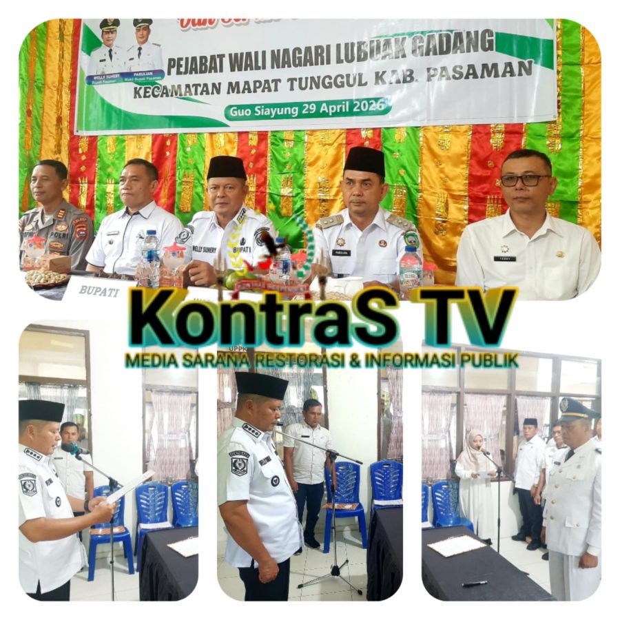www.kontrasindependent.com Pasaman, Sumatera Barat. Mempercepat akselerasi program Nagari Bangkit, Bupati Pasaman Welly Suhery melantik 3 (tiga) Penjabat Wali Nagari di Pasaman yakni Wali Nagari Lubuak Gadang Kecamatan Mapat Tunggul dan Wali Nagari Koto Rajo serta Wali Nagari Kotanopan Kecamatan Rao Utara digelar di dua lokasi, Rabu (29/4/2026).