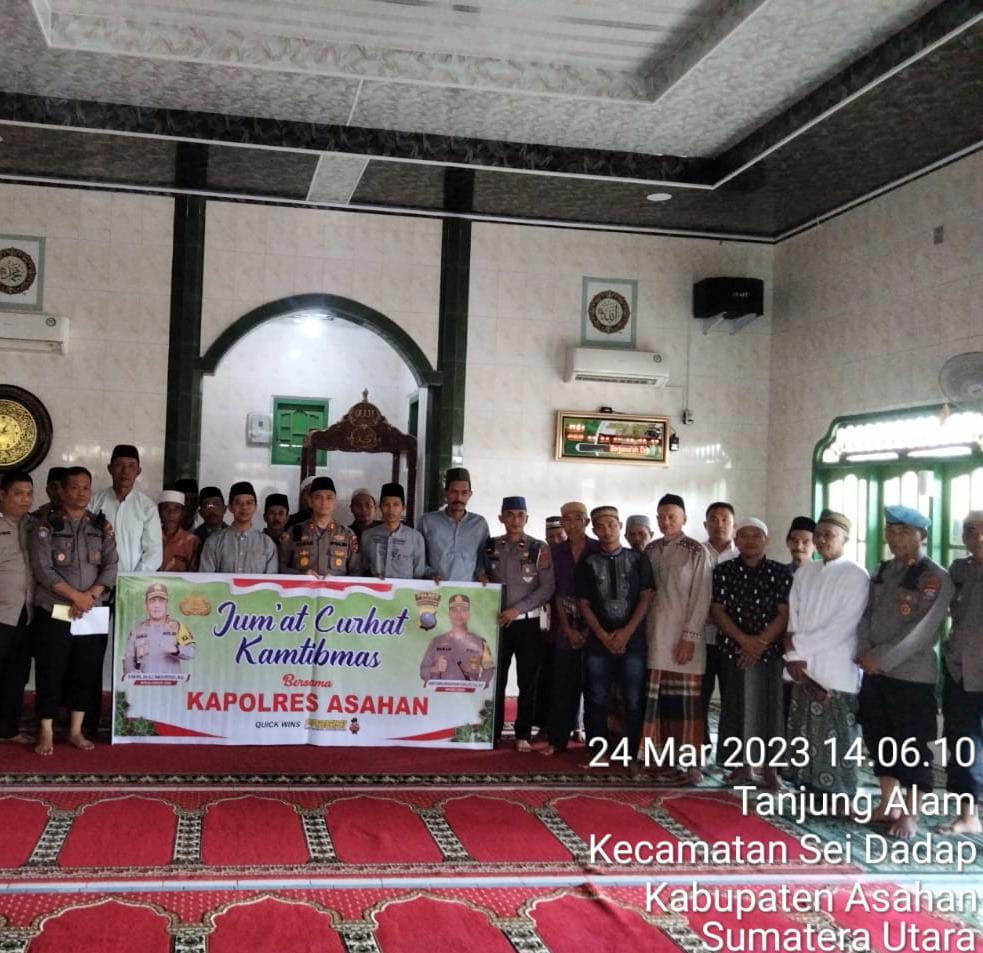www.Kontrasindependent.com-Kabupaten Asahan, -Kapolres Asahan menyambangi warga masyarakat yang berada di di Masjid Al Muttaqin Dusun VII Desa Tanjung Alam Kecamatan Sei Dadap Kabupaten Asahan, Kapolres Asahan AKBP Roman Smaradhana Elhaj, SH, SIK, MH menyampaikan Pesan-pesan Kamtibmas Jumat (24/03/2023)