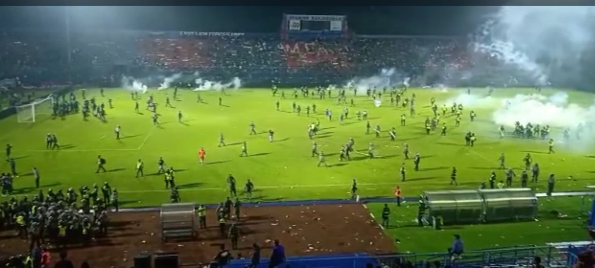 Ribuan Petugas keamanan TNI dan Polri nampak terlihat mengalau para suporter namun nampak kuwalahan karena jumlah ribuan lebih banyak dari perugas, hingga perugas mengeluarkan gas air mata akhirnya banyak suporter tumbang melalui informasi yang beredar 125 suporter Arema meninggal dunia dan 2 orang anggota kepolisian juga menghembuskan nafas terahir.