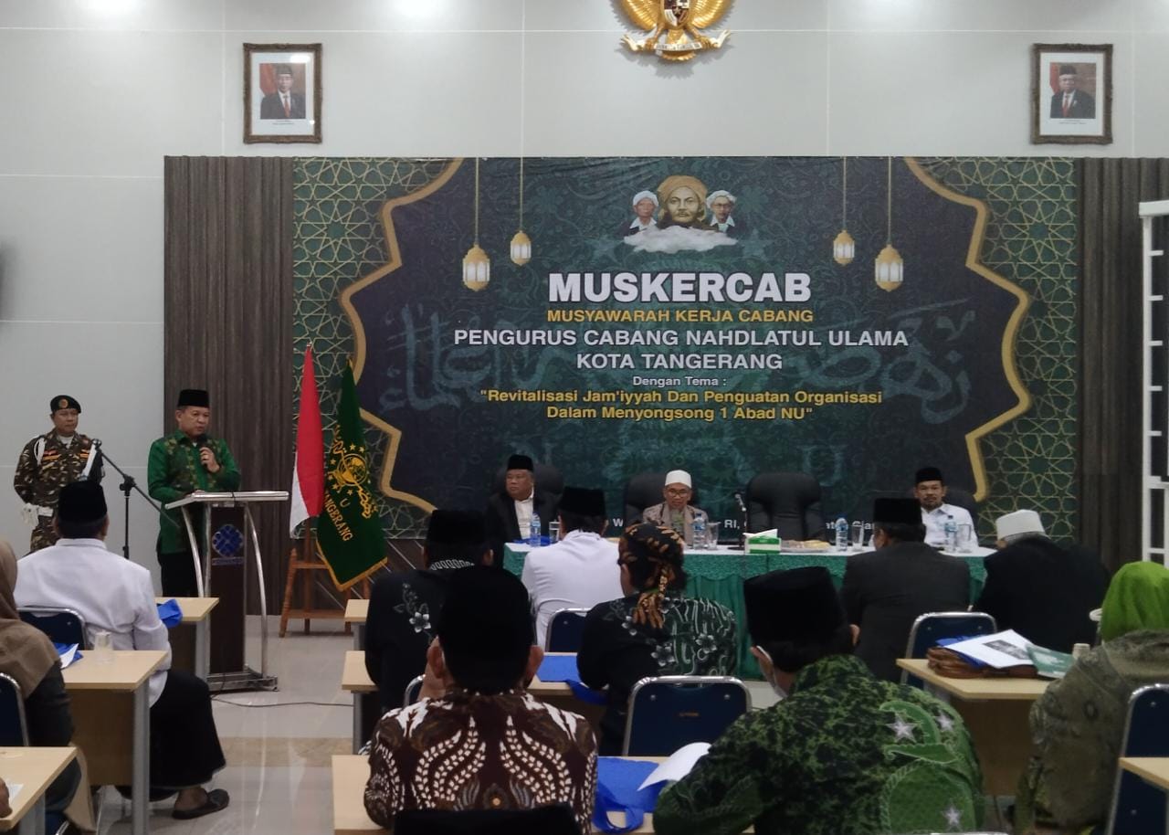 Ketua PCNU Kota Tangerang Drs K.H Dedi Mahfudin M.Si, membuka acara yang digelar di Wisma Kemnaker RI, dengan Tema “Revitalisasi Jam’iyyah dan Penguatan Organisasi dalam Menyongsong 1 Abad NU’.