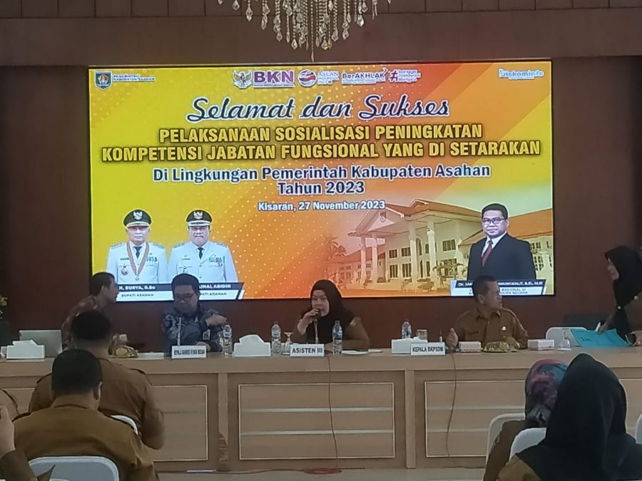 Pada hari ini senin di Pendopo Rumah Dinas Bupati Asahan Jl. Jend. Sudirman Kisaran dilakukan pembukaan acara sosialisasi Jabatan Fungsional dari pukul 08.00 wib sampai dengan pukul 12.00 wib, dalam hal ini acara dibuka oleh Asisten III Drs.H. Muhili S.sos dan kepala kepegawaian Daerah kabupaten Asahan, serta dihadiri oleh seluruh kepala dinas se-kabupaten Asahan berjumlah 50 orang dan keterwakilan masing – masing dinas terkait. .