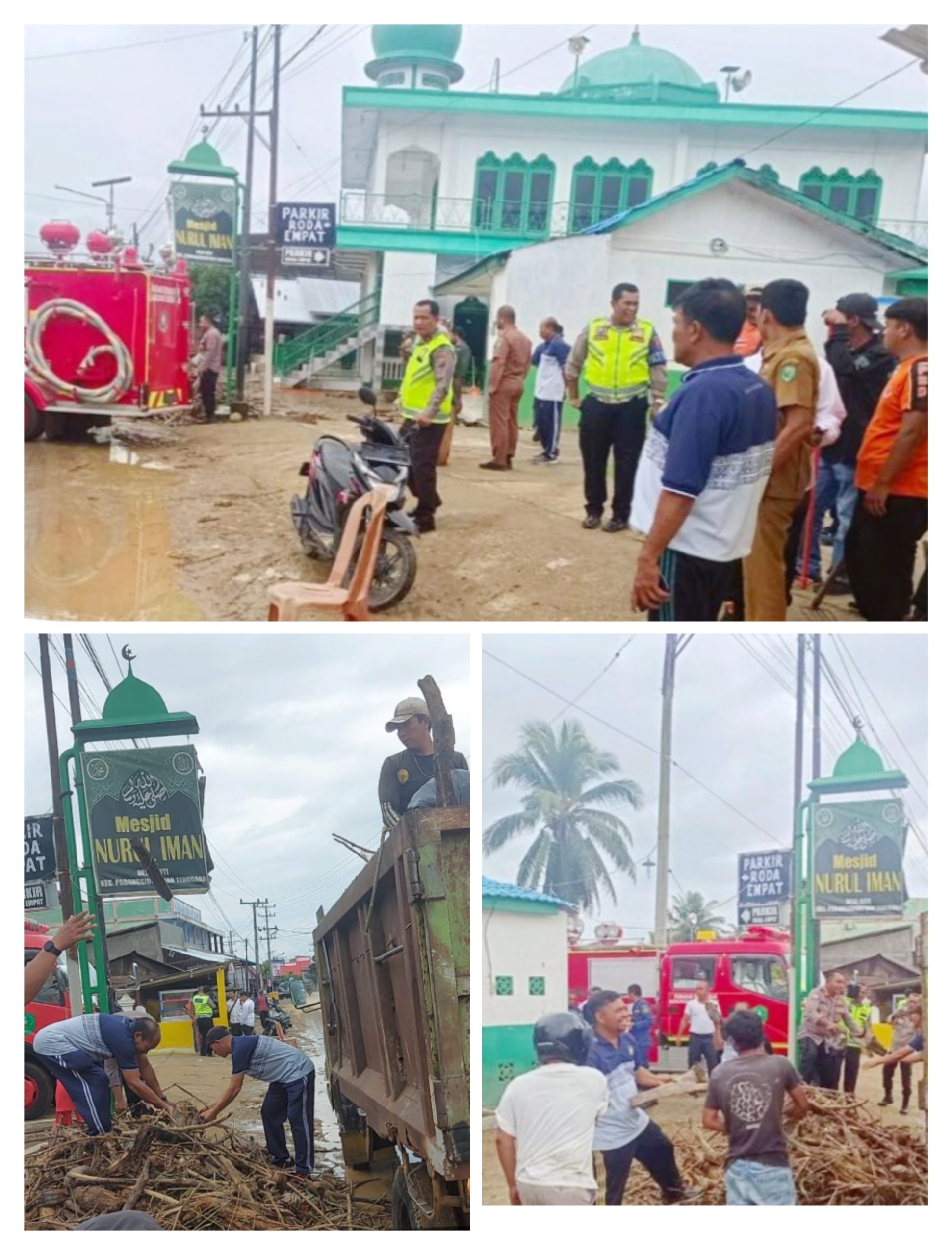 dan Bhabinkamtibmas ke lokasi untuk membantu membersihkan jalan raya dan rumah-rumah warga yang terdampak banjir.