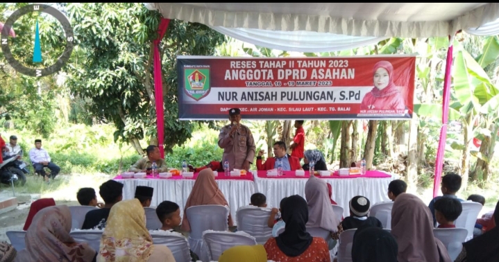 Www.kontrasindependent.com-Kabupaten Asahan, -Personel Polsek Air Joman menghadiri reses tahap II Tahun 2023 di Dusun IV Desa Pasar Lembu Kecamatan Air Joman, Minggu (19/03/23).