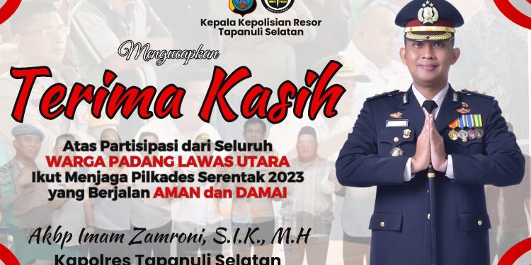 Padang Lawas Utara – Kapolres Tapanuli Selatan (Tapsel), AKBP Imam Zamroni, SIK, MH, mengucapkan terima kasih ke seluruh elemen masyarakat atas kesuksesan Pilkades di Kabupaten Padang Lawas Utara (Paluta).