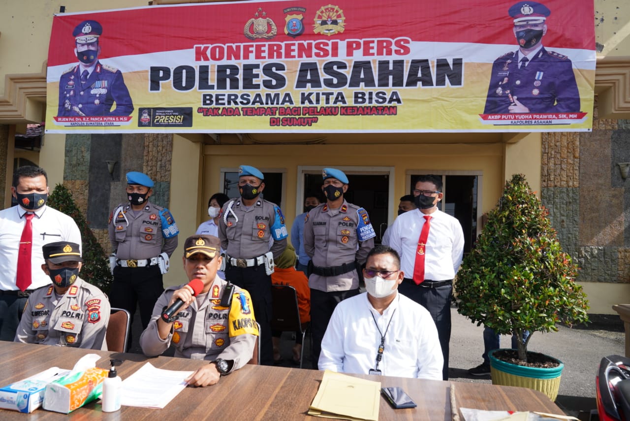 Kabupaten Asahan Sumatera Utara- AKBP Terkait pengungkapan kasus pembuangan bayi berjenis kelamin laki-laki yang ditemukan dalam keadaan meninggal dunia dialiran sungai sitio – tio yang ada di Dusun V Desa Sei Silau Barat Kec Setia Janji Kab. Asahan Kapolres Asahan Gelar konferensi Pers.