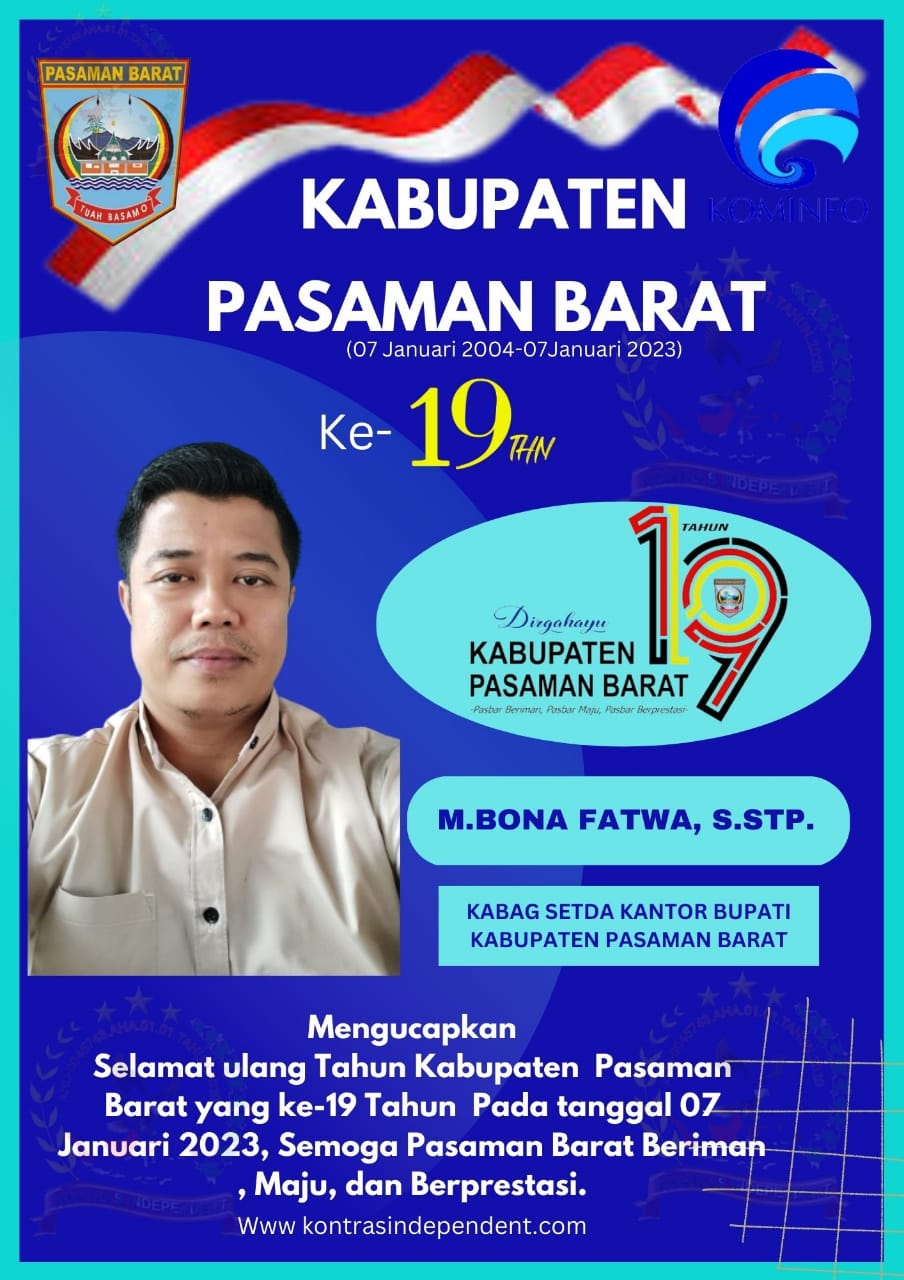“Mengucapkan “selamat ulang Tahun Pasaman Barat yang ke-19. Pada tanggal 07 Januari 2023, semoga Pasaman Barat Maju, Beriman, dan Berprestasi. Publisher Red
